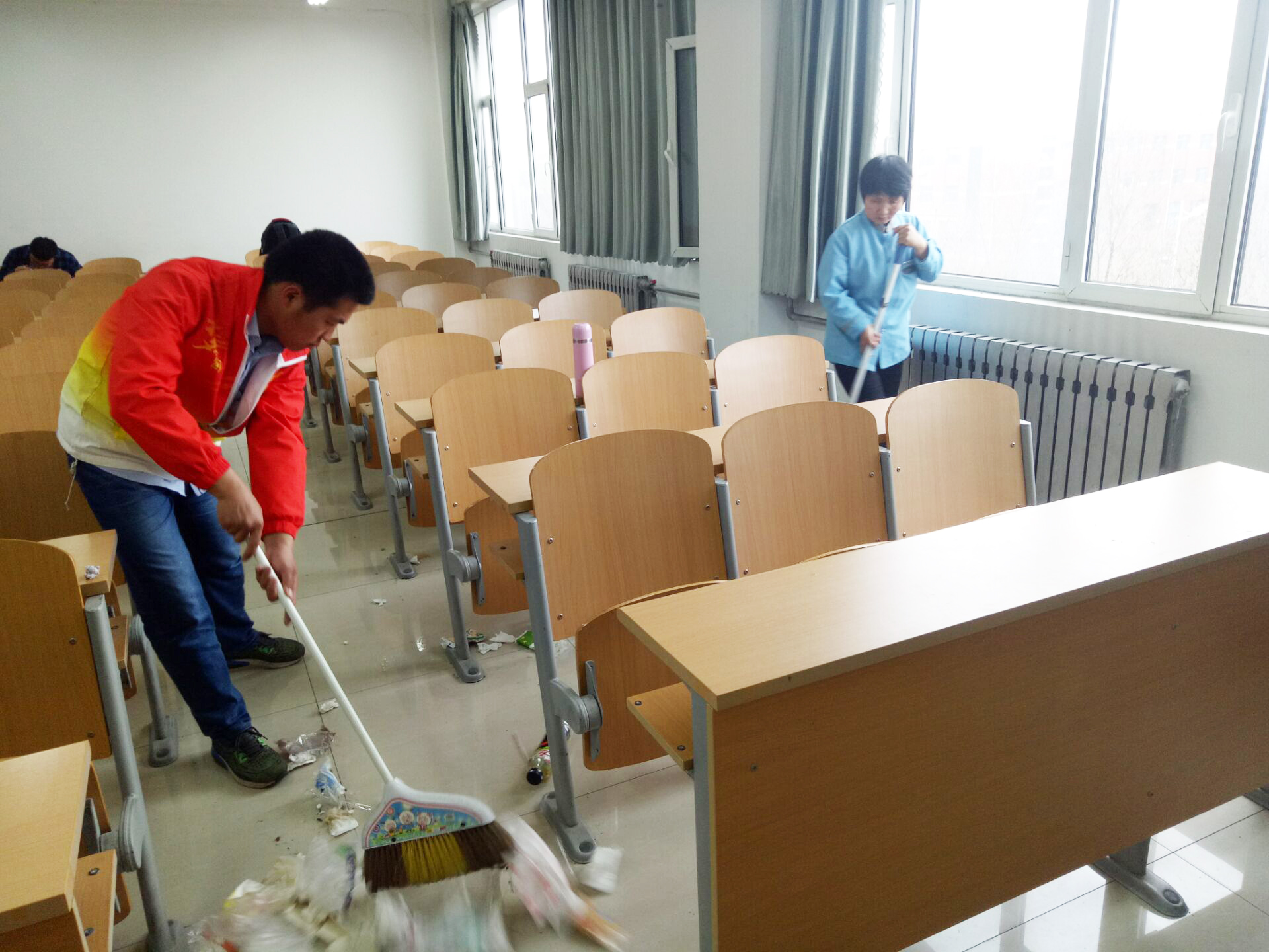 在此次活动中,同学们负责好自己的区域,男生四人一层,女生六人一层,分别协助保洁阿姨打扫教室卫生。打扫完成后,同学们还与阿姨进行交谈。在交谈过程中,同学们了解到教室卫生不易打扫、同学们不珍惜阿姨的劳动成果导致清洁更加困难等问题。此次活动虽然只有短短的一小时,却取得了很好的效果,也让同学们明白了阿姨的辛劳。