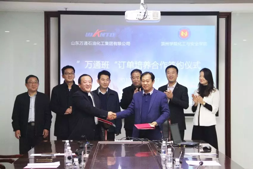 为了促进学校发展,提供同学们学习能力,11月8日,我院与山东万通石油化工集团有限公司在控股集团15楼会议室举行了“万通班”校企合作签约仪式。我院党总支副书记张健、副院长商希礼、学生科长金志杰等院领导与万通海欣控股集团总工程师吕兰涛、万通石化集团总经理刘洪涛等集团领导共同出席此次签约仪式。