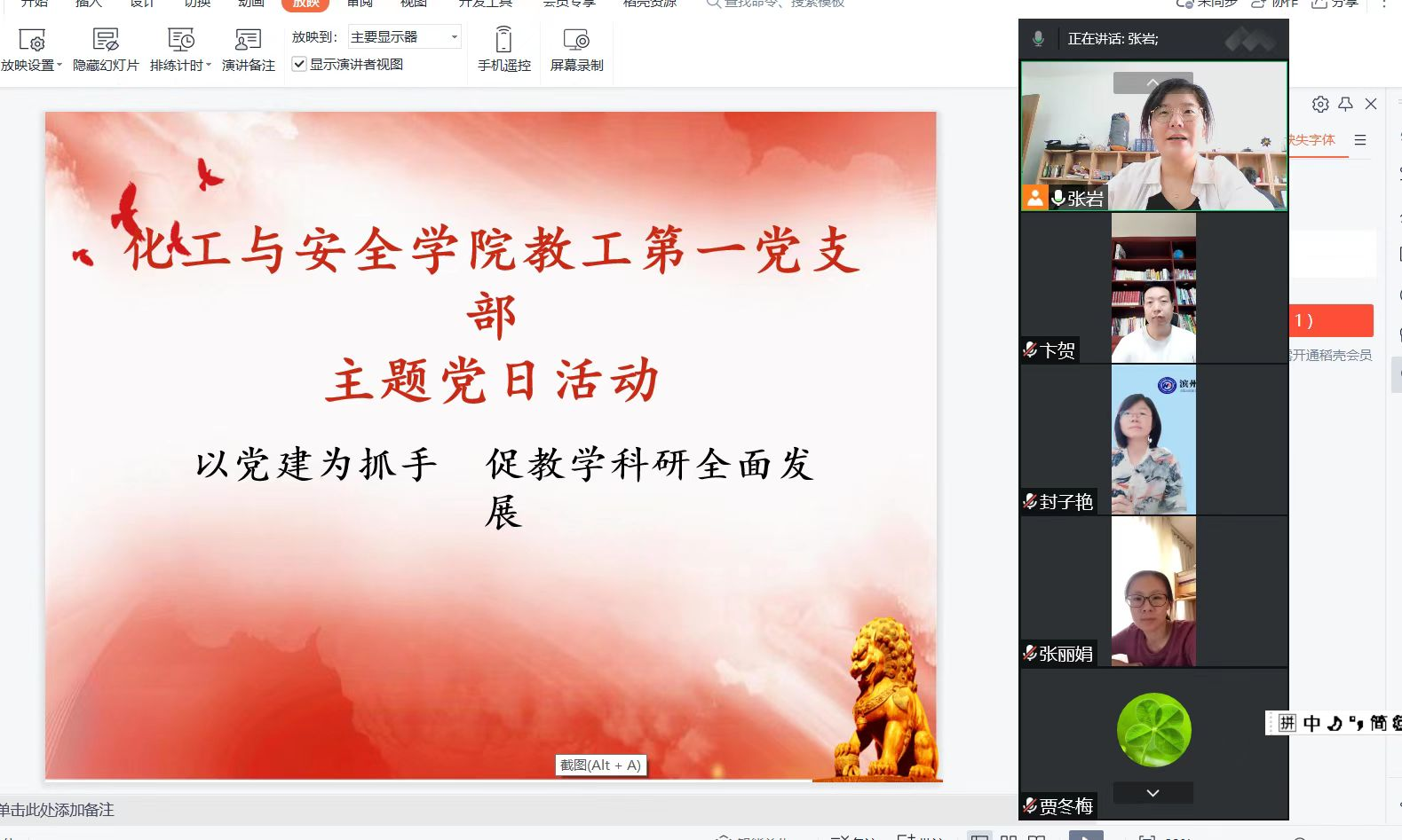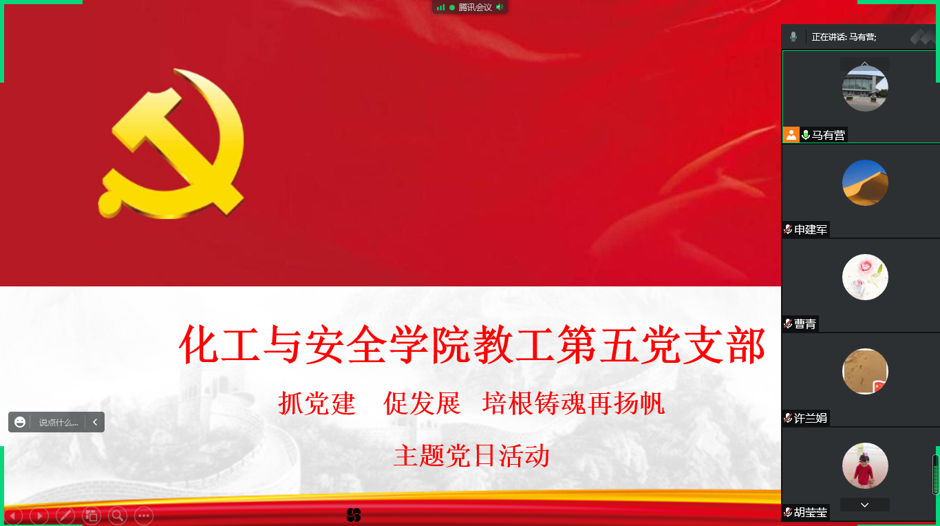 9月20日,化工与安全学院党总支组织开展“抓党建 促发展 培根铸魂再扬帆”主题党日活动。活动由党总支书记王建主持,分总支和支部两个层面开展。本次主题党日活动在集中学习《习近平谈治国理政》第四卷154页《构建新发展格局 、重塑新竞争优势》和《党委副书记、校长李长海同志在学校党建工作领导小组会议上的讲话》两个材料的基础上,党总支班子成员和各党支部组织全体教师针对党建与业务相融合的背景下,如何做好学科建设、专业建设、教师队伍建设、教学管理、学生管理和工会等工作开展热烈而深入的讨论。