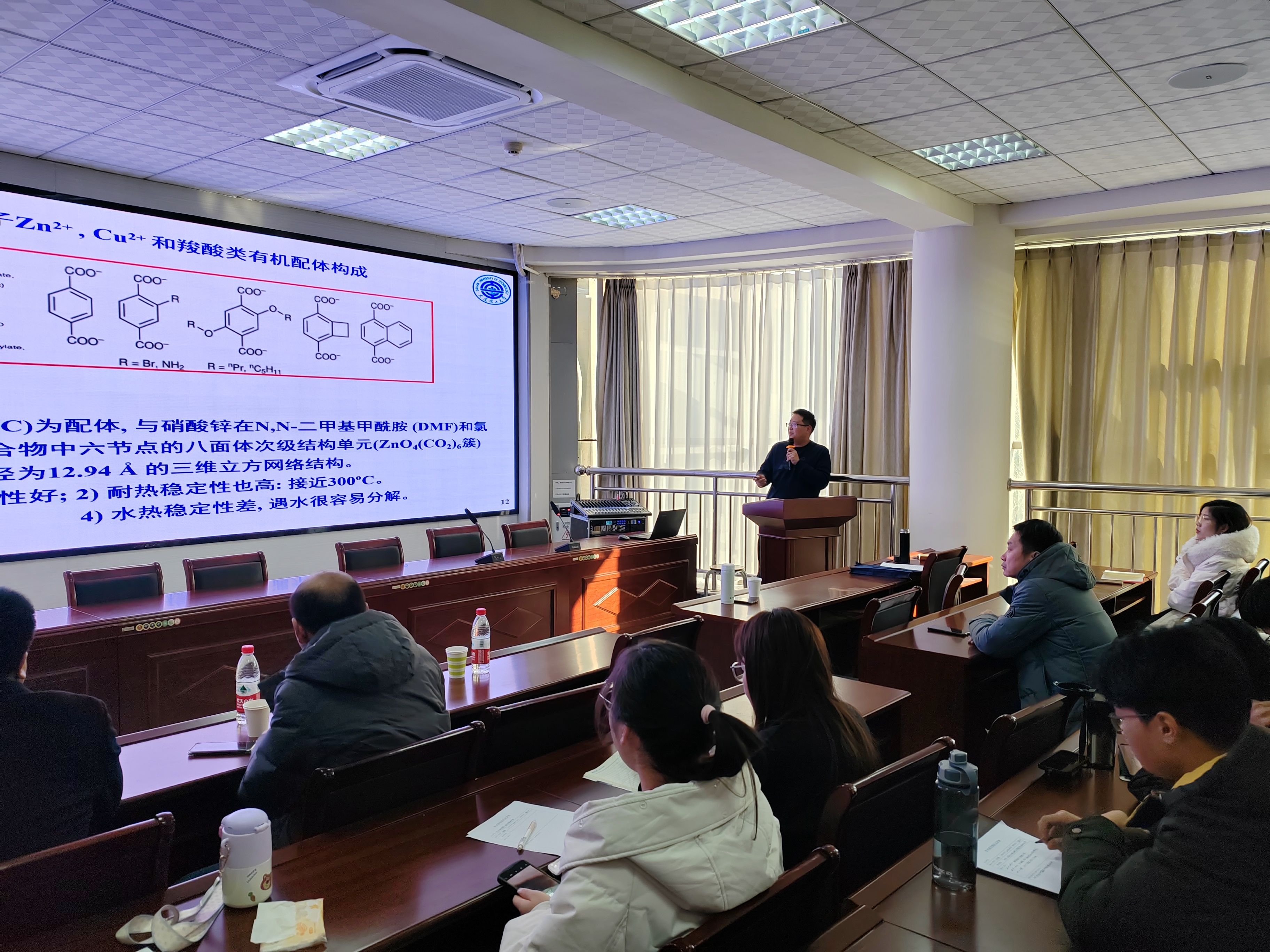 张旭副教授从MOFs基础理论、MOFs及其衍生物的构筑、MOFs及其衍生物在超级电容器中应用及MOFs及其衍生物在锂硫电池中应用等4个方面进行了深入的阐述。报告会后与部分教师进行互动,并提出具体建议。报告内容丰富,形象生动,参会教师与学生受益匪浅。