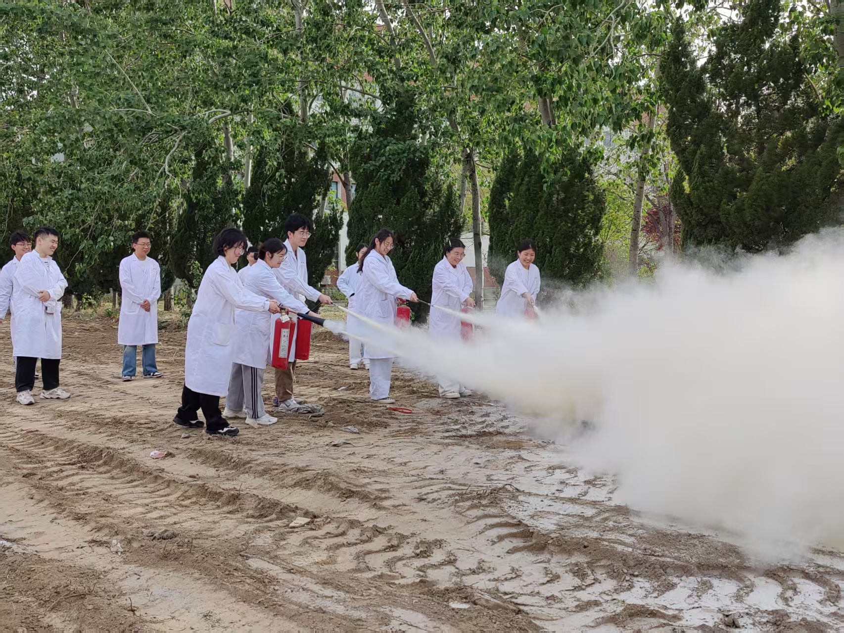 随后,党员们分组排队有序参与灭火演练。他们手持灭火器,面对浓烟升腾的模拟火源,临危不乱、冷静沉着地相互提醒、配合默契,一人托住灭火器底部,一人握紧提把,执行正确操作步骤。从拔掉保险销、对准火源根部到按压把手,当最后一丝火苗在白雾中熄灭,标志着师生们齐心协力成功完成了模拟灭火任务。