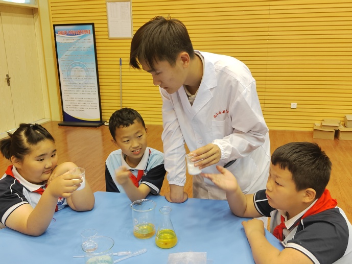 活动中,15名志愿者化身“化学导师”,带领同学们分组操作、记录现象、交流猜想,在“观察—提问—验证”的过程中培养科学思维。