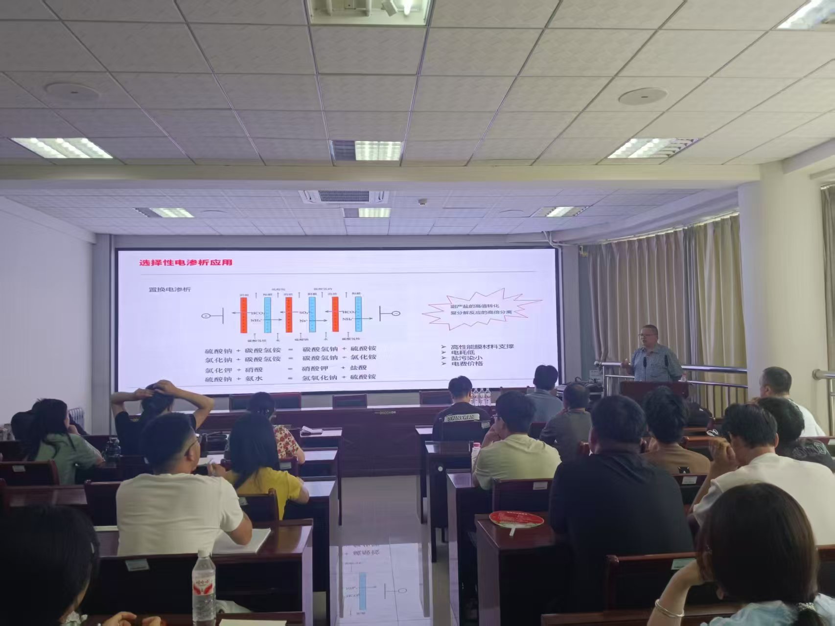 报告中,沈江南教授系统介绍了传统电渗析及双极膜电渗析、反向电渗析、置换电渗析、选择性电渗析和冲击电渗析等六种新型电渗析技术的工作原理,并重点分析了这些技术在碳捕集转化、高盐废水资源化等领域的应用进展。他结合团队研究成果指出,离子膜电渗析技术具有高效、节能和环保优势,是实现工业废水处理与低碳减排的重要技术路径。