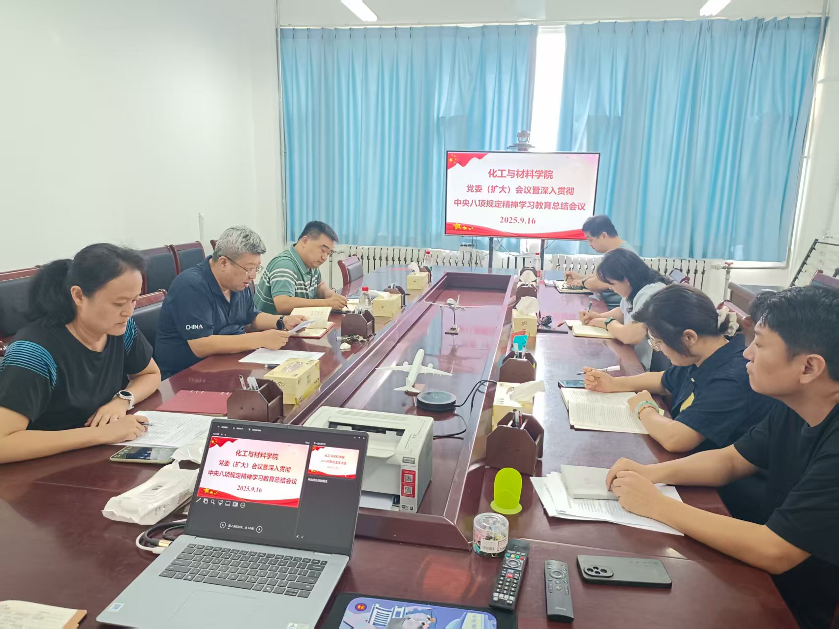 9月16日上午,我院党委在8-316会议室召开党委(扩大)会议暨深入贯彻中央八项规定精神学习教育总结会议。会议旨在进一步深入学习领会习近平总书记关于作风建设的重要指示批示精神,全面总结学院前期专项学习教育工作开展情况,并就持续巩固拓展学习教育成果、推动作风建设常态化长效化进行再部署、再强调。学院党委书记王建主持会议并讲话,学院党委班子、各党支部书记等参加了会议。