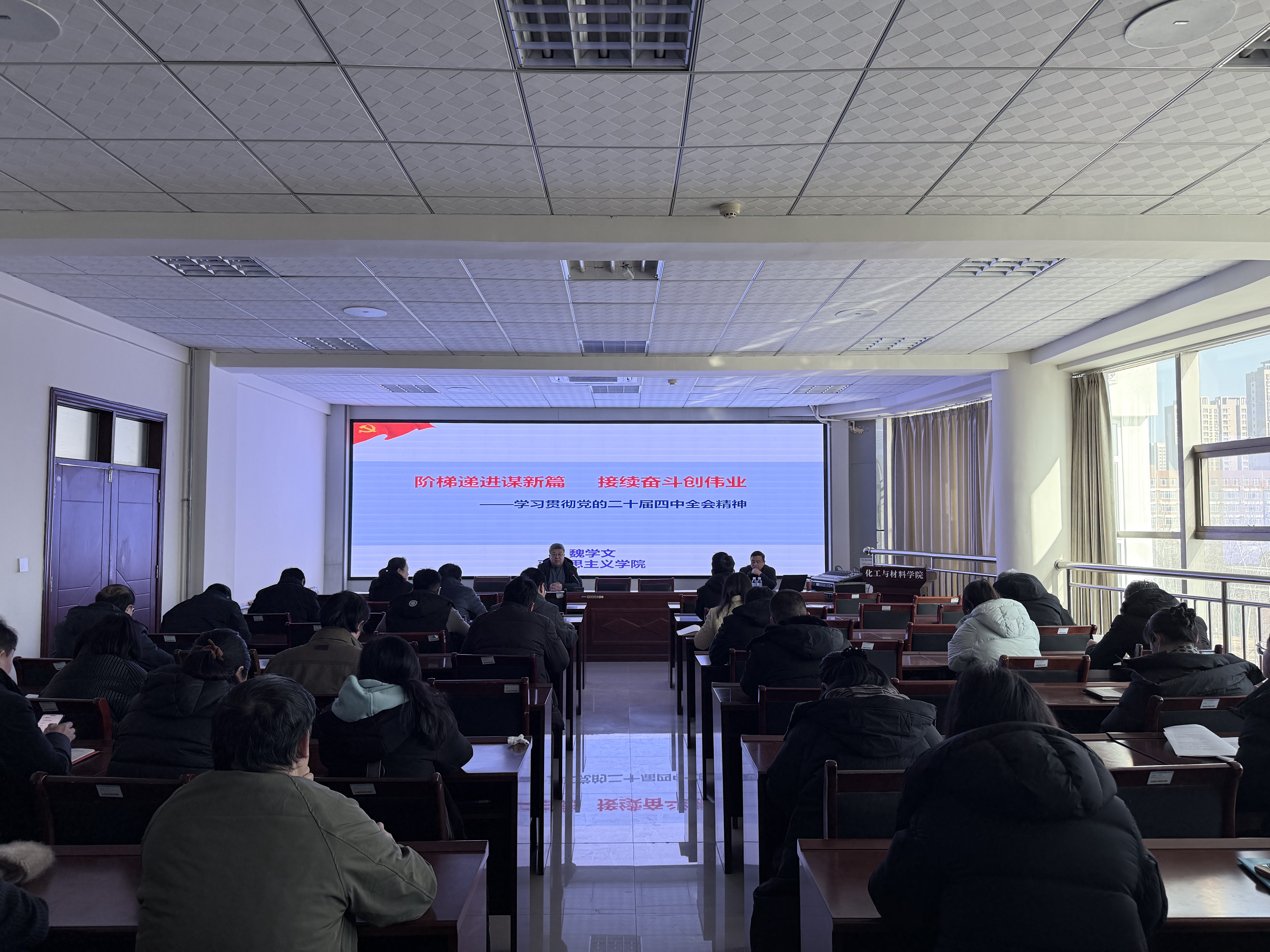 为深入学习领会、全面准确把握党的二十届四中全会精神的核心要义,英国正版365首页党委1月13日在9-313会议室举办了“党的二十届四中全会精神解读”专题讲座。本次讲座特邀学校宣讲团成员、马克思主义学院魏学文教授担任主讲。讲座由学院党委书记主持。学院党政领导班子成员、全体教职工党员及部分师生群众参加了学习。